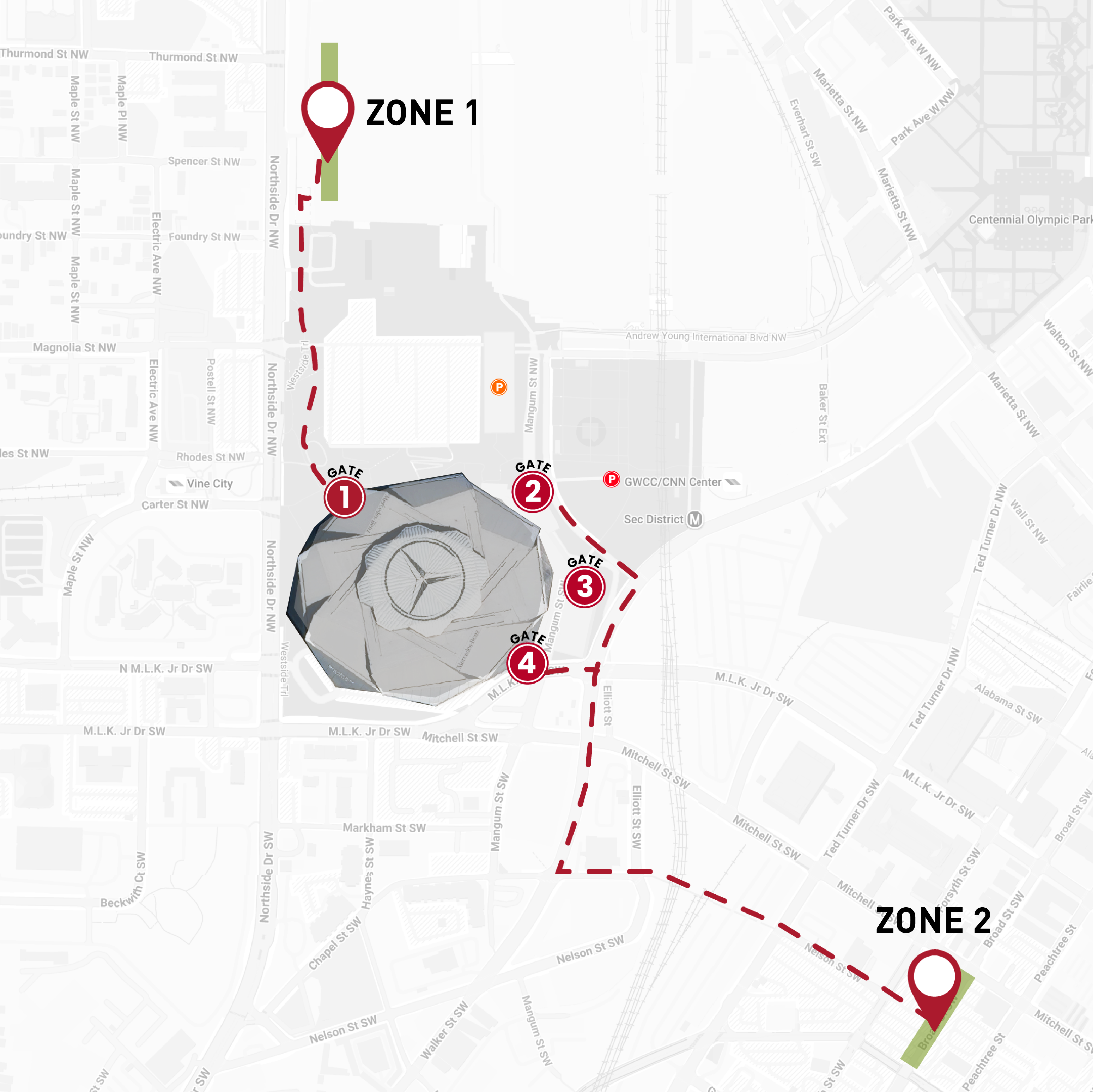 *Please note that due to construction, the west exit at SEC District Station (leading to the Red Deck bridge) will be inaccessible through April. During this time, fans will enter and exit on the east side of the station, closest to State Farm Arena. Please plan accordingly when arriving and departing the stadium.